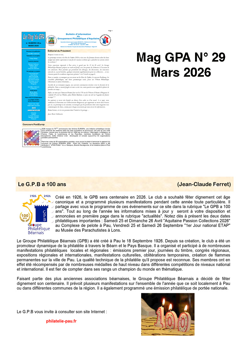 Le Groupe Philatélique Béarnais a organisé sa fête annuelle le Dimanche 8 Octobre dans la halle de Billère . A cette occasion Mr Delalande, correspondant Pyrénées Presse, est venu faire un reportage sur place et à fait paraître un article sur le club dans l'édition du Jeudi 22 octobre