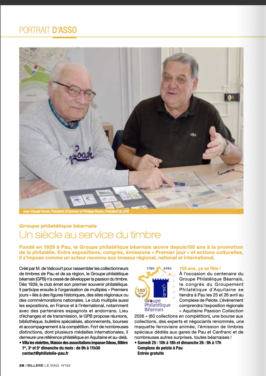 Le magazine mensuel de Billère a fait paraitre une interview de Philippe Rozen, Pdt du GPB, et de Jean-Claude Ferret, Pdt d'honneur du GPB. Cet interview a été donnée à l'occasion de l'annonce de la manifestation "Aquitaine Passion Collection 2026" des 25 et 26 Avril au Complexe de Pelote de Pau. Au cours de cet interview les deux responsables du club ont également abordé les prochaines manifestations liées au centenaire du club et le type d'activités menées par le GPB.
