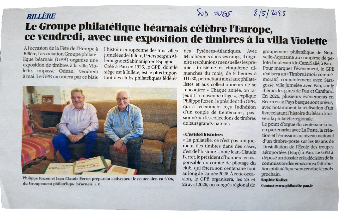 Philippe Rozen, Président du GPB, et Jean-Claude Ferret, en charge du Comité des 100 ans, ont été interviewés par Mme Kalisz, correspondante de Sud-Ouest, pour évoquer les préparatifs du centenaire du club. Cette rencontre organisée à l'occasion de la participation du GPB à la Fête de l'Europe à Billère a permis d'aborder non seulement les activités prévues pour 2026 mais de parler également de manière plus générale de la philatélie et du futur de notre passion.