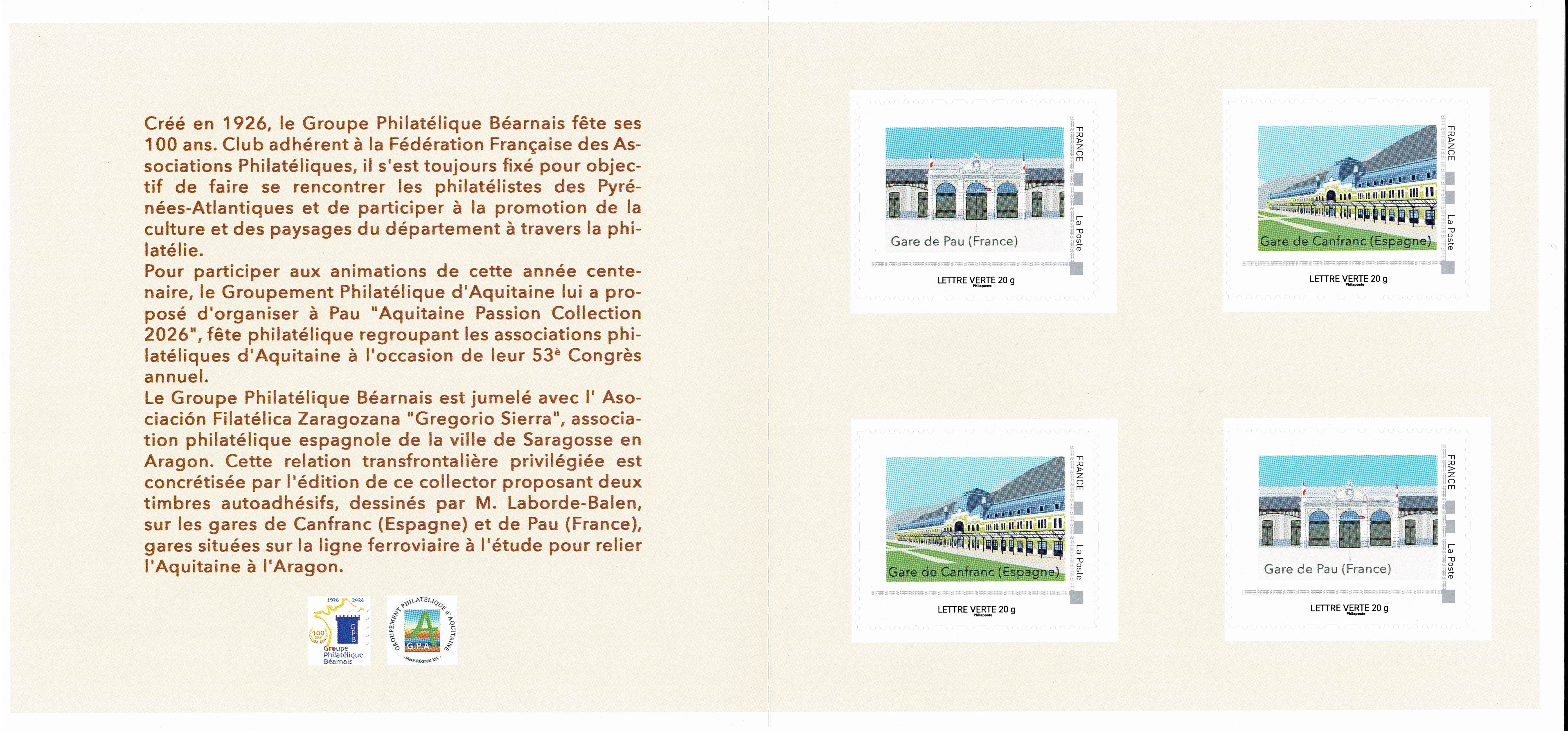 Un collector de 4 Timbres-poste autoadhésifs, vendu au tarif unitaire de 10 €, est édité avec 2 timbres-poste sur la Gare de Pau et 2 Timbres-poste sur la Gare de Canfranc.